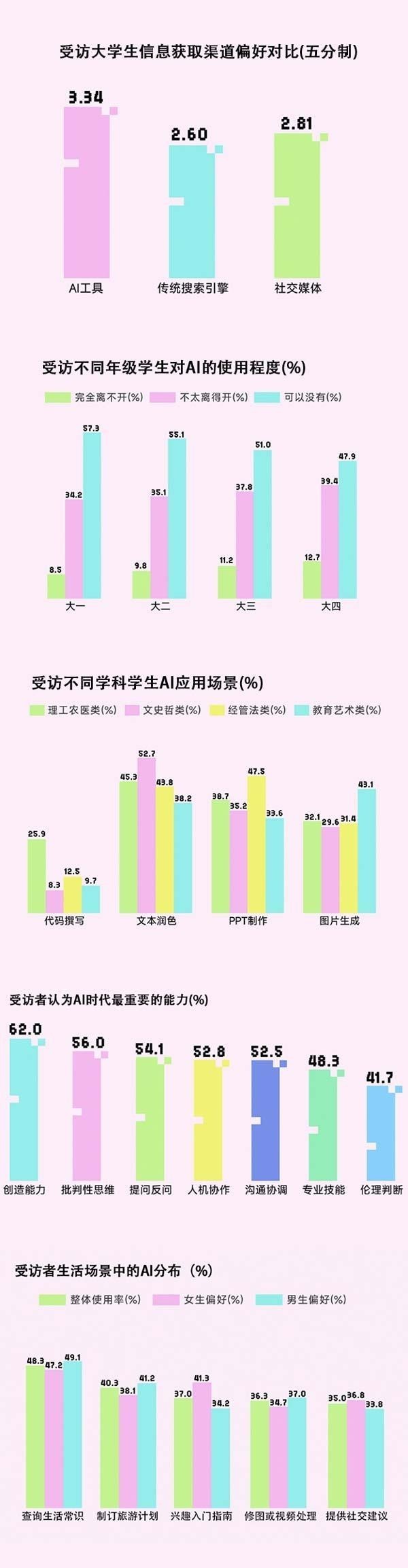 調查發現,查詢生活常識(48.3%)、制訂旅游計劃(40.3%)、提供運動藝術等入門指南(37.0%)、修圖或視頻處理(36.3%)和提供社交建議(35.0%)是AI在受訪大學生生活中應用相對更廣泛的場景。