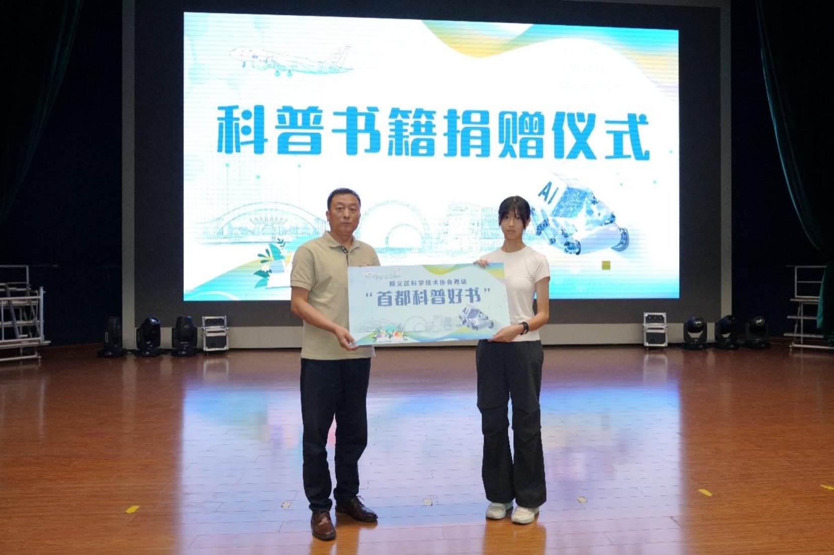 順義一中學生代表陳宜萱同學隨后發言,表達了順義學子們對科學的熱愛與向往。順義區教委體衛藝科科技教育活動負責人任立春為學生代表贈送了科普圖書。