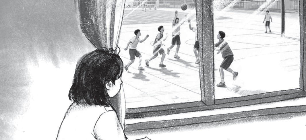 高東琴坐在教室后排椅子上,望著窗戶外的校園運(yùn)動場。場上有幾個(gè)男生在打籃球,叫喊著,拼搶著,特別歡樂。