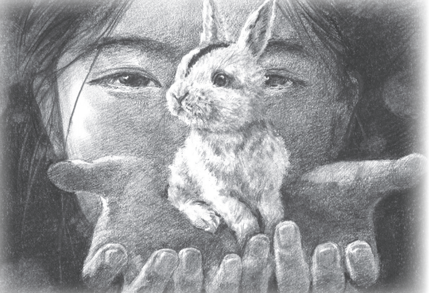 光子說:“哎媽,美麗的兔子,它還有一對黑眼圈呢,哇!脊背上的黑毛長得也太直溜啦,我用筆都畫不了這么直溜。”