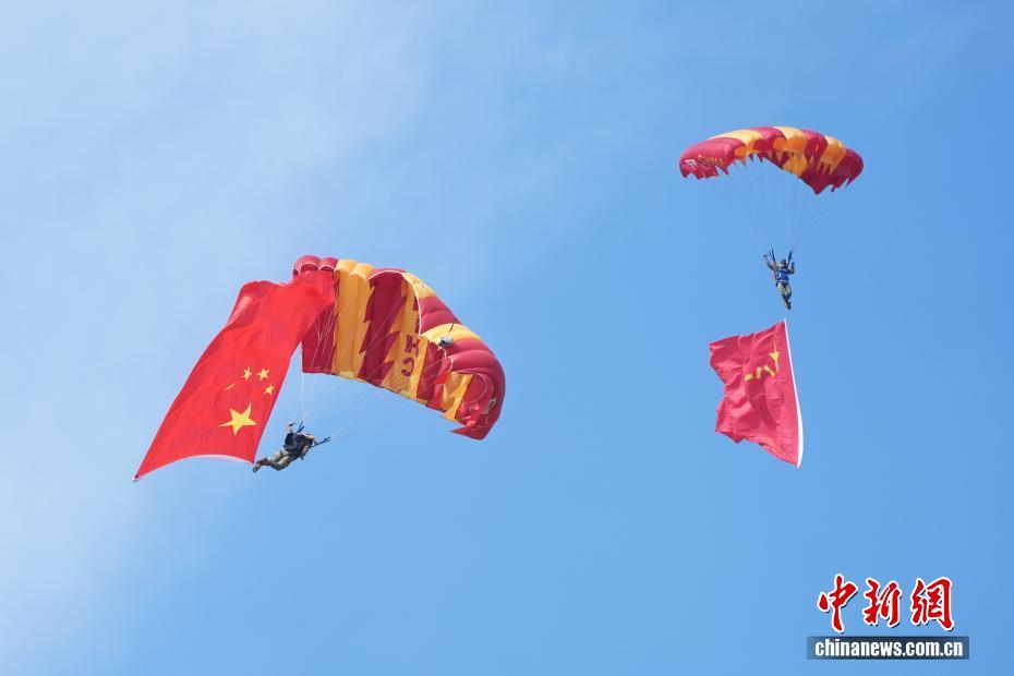 9月19日,2025空軍航空開放活動和長春航空展在吉林長春開幕。圖為中國人民解放軍“八一”跳傘隊表演。