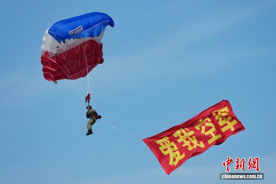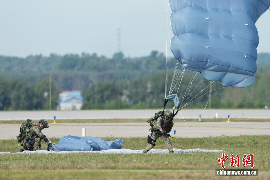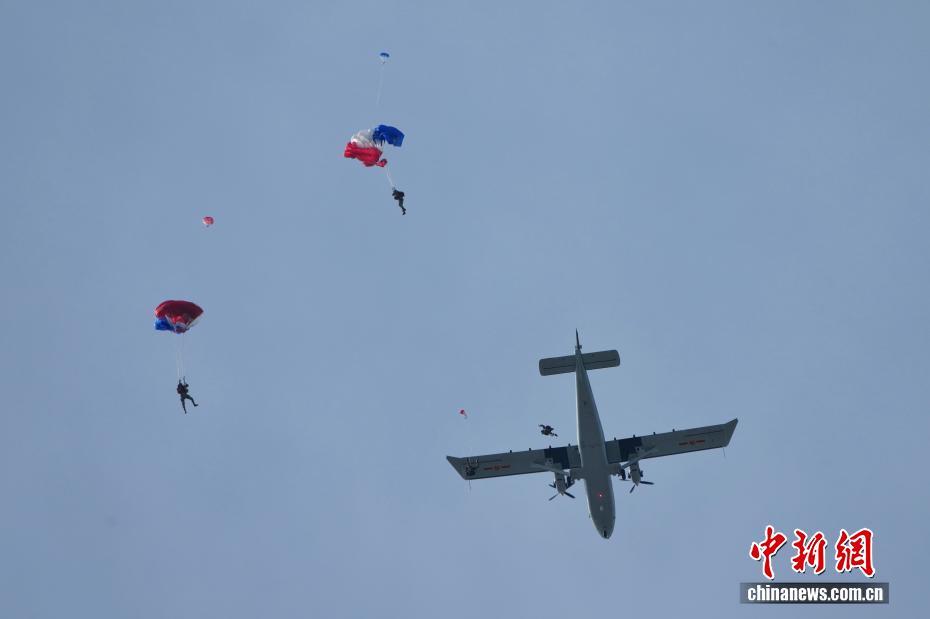 9月19日,2025空軍航空開放活動和長春航空展在吉林長春開幕。圖為空降兵傘降投送展示。