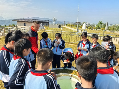 在氣象局講解員黃金洪老師的引導下,同學們走進氣象觀測區(qū)域,近距離認識了濕度儀、風向風速儀、日照記錄儀和蒸發(fā)量測量儀等專業(yè)設(shè)備。黃老師的講解生動專業(yè),同學們認真記錄,展現(xiàn)出濃厚的求知熱情。