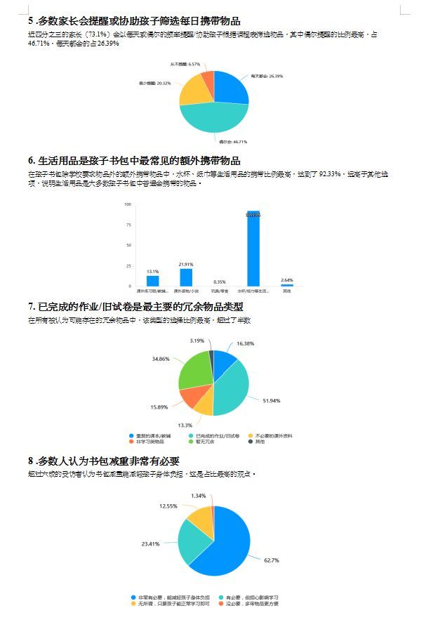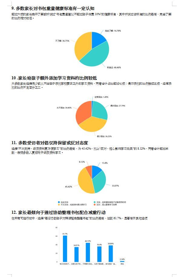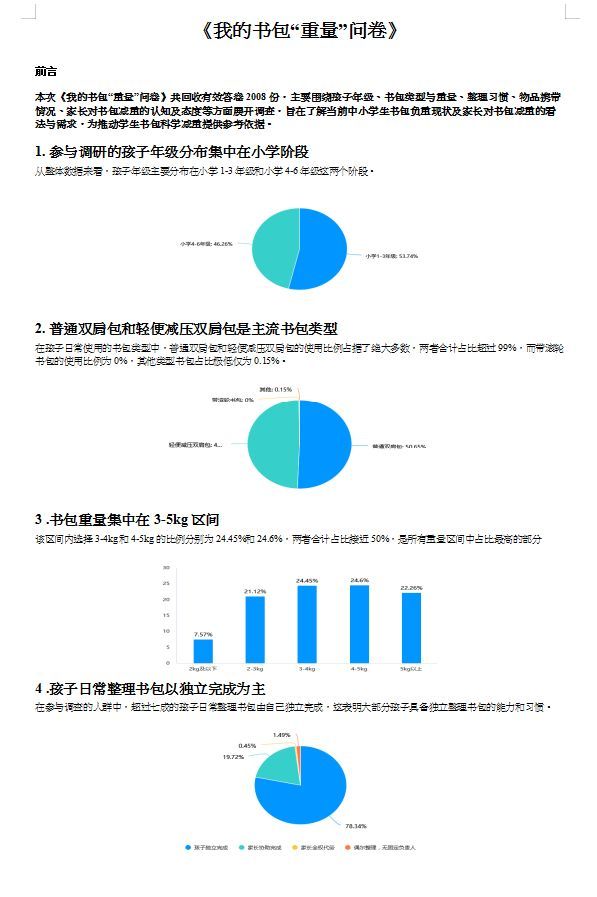 活動伊始,學校通過設計調研問卷,全面摸底書包過重的“痛點”與“堵點”。從“問卷截圖”中可以看到,學生家長對“書包減負”的關注度與參與意愿極高,大家紛紛就“書包里的冗余物品”“作業的分層優化”等問題建言獻策。基于調研數據形成的分析報告,為后續活動的精準開展提供了科學依據。