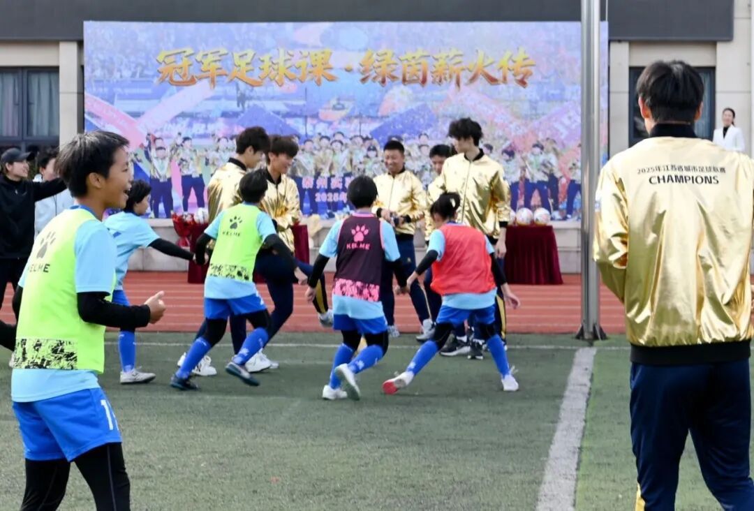 在這個金色的收獲季節,泰州多所學校的綠茵場上沸騰著前所未有的激情與夢想。11月3日起,剛剛奪得首屆江蘇省城市足球聯賽(“蘇超”)冠軍的泰州足球隊,帶著勝利的榮光與拼搏的熱忱,相繼走進校園參與“冠軍足球課·綠茵薪火傳”主題活動,首站來到泰州實驗學校為少先隊員們帶來了一堂生動而深刻的體育精神課。
