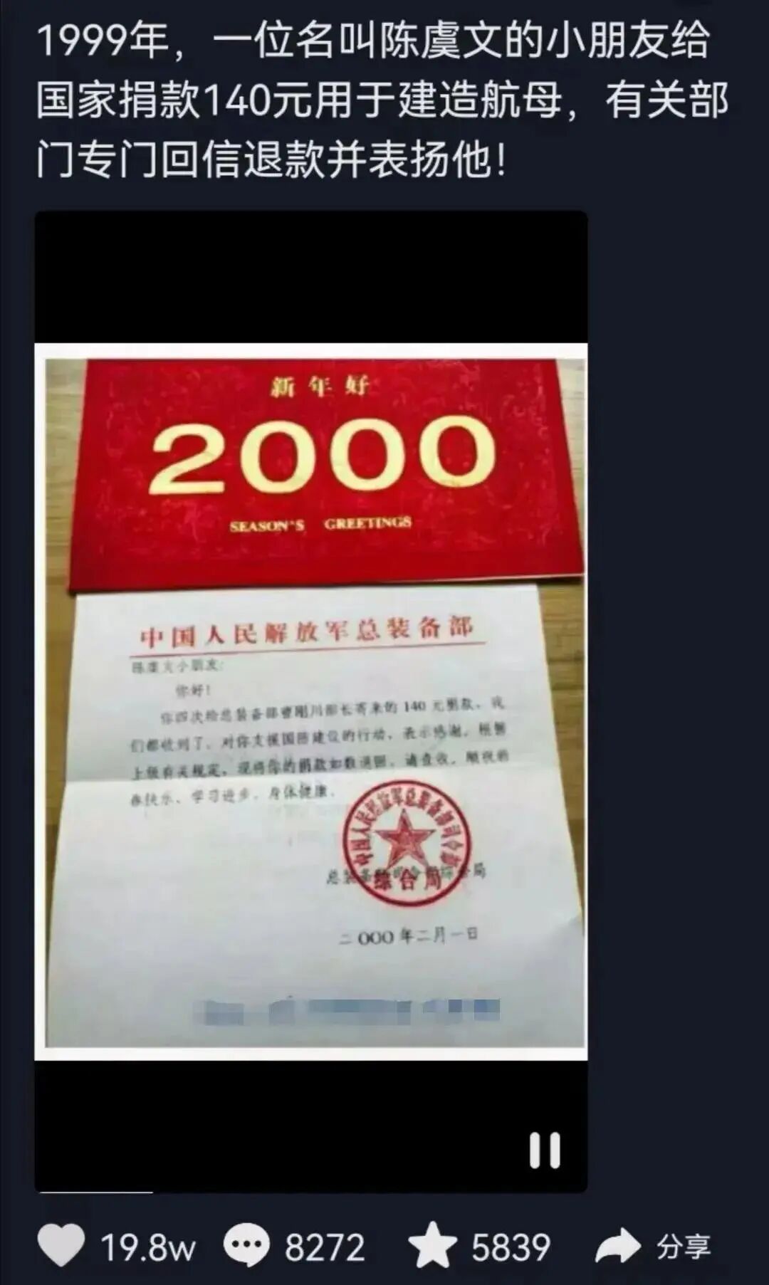 “1999年,一位名叫陳虞文的小朋友給國家捐款140元,用于建造航母,初衷很簡單——‘為了祖國不被欺負’,有關部門專門回信退款并表揚他!”