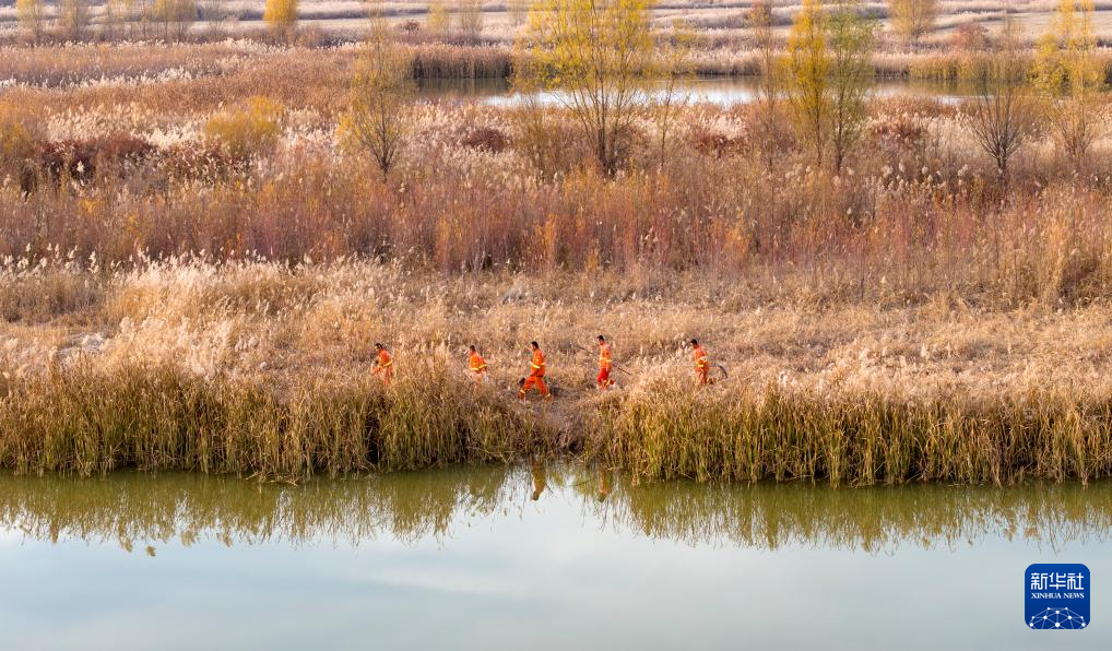 11月11日,工作人員在寧夏平羅天河灣國家濕地公園內巡查。