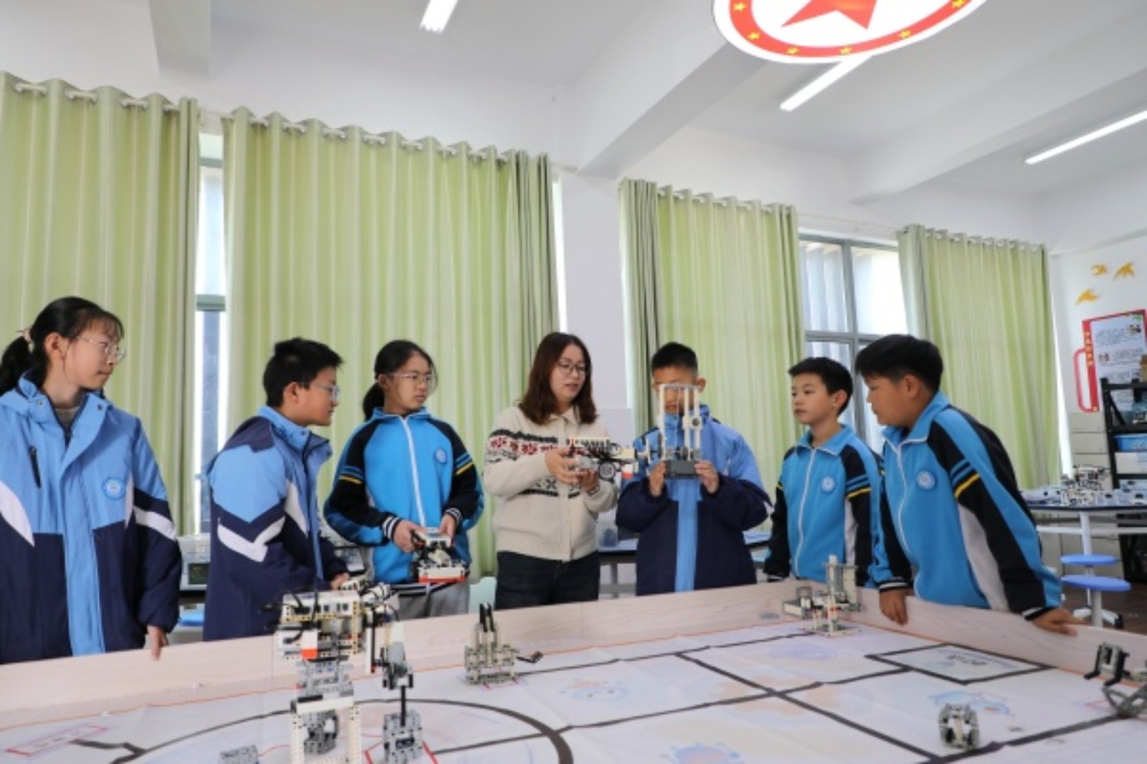 集團打造了“四位一體”的科技課程體系:夯實國家科學課程基礎,拓展機器人編程等社團課程,強化競賽集訓隊挑戰,并深化跨學科融合實踐,如在科學課中運用數學分析、在編程課中融入紅色教育,形成全學科育人合力。