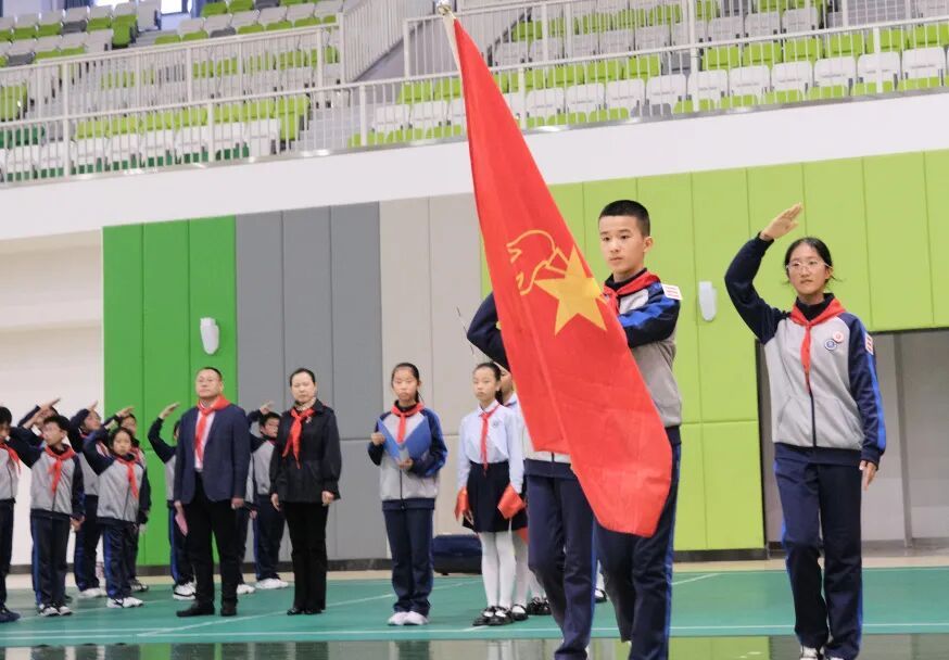 伴隨著激昂的《出旗曲》,少先隊旗手邁著堅定的步伐,高舉隊旗緩緩入場。全體師生肅立敬禮,目光追隨著鮮艷的隊旗,心中充滿了對少先隊組織的崇敬與向往。嘹亮的《中國少年先鋒隊隊歌》響徹校園,歌聲中滿是少年們的朝氣與熱情,也拉開了入隊儀式的序幕。